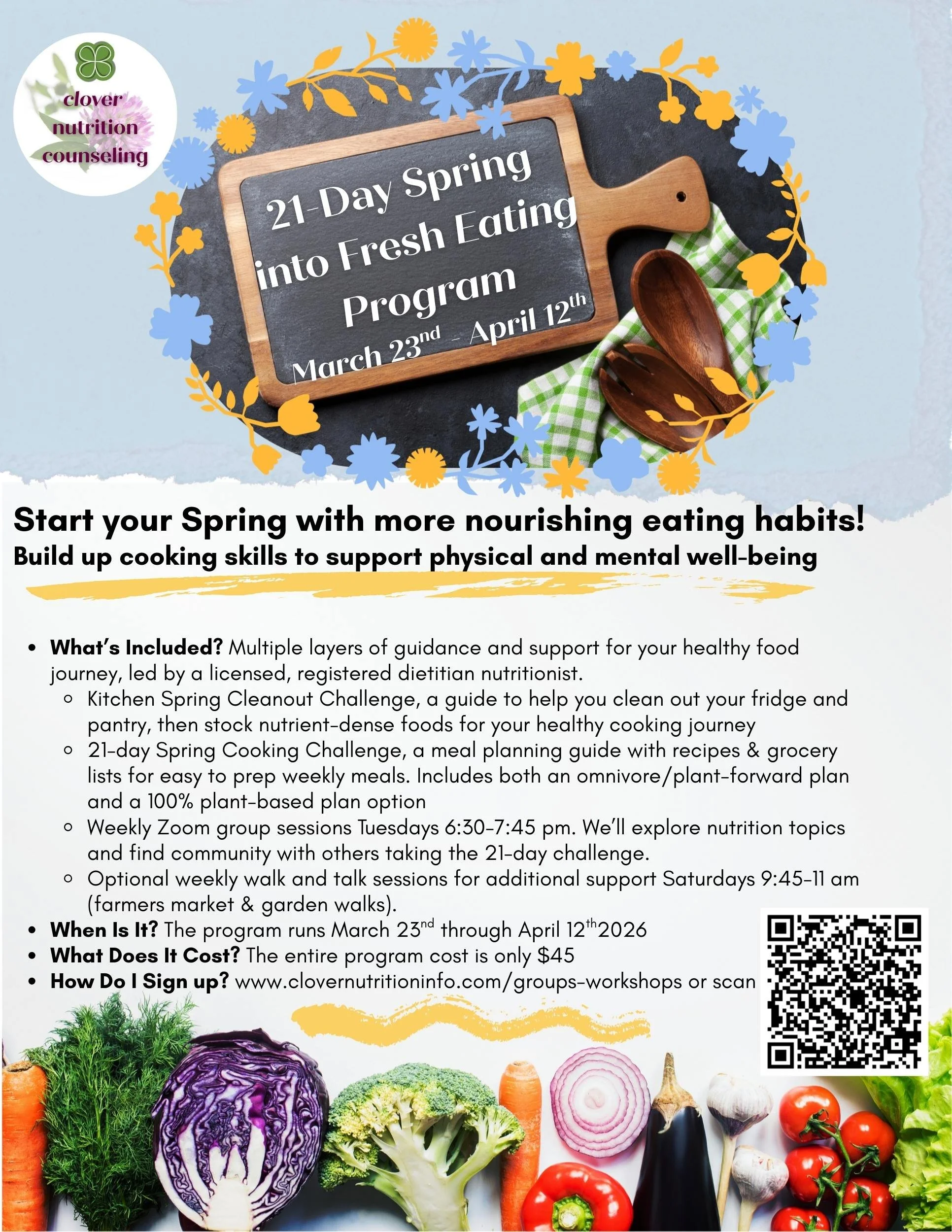 21-day Spring Cooking challenge includes recipes & grocery list for easy to prep weekly meals. Both an omnivore/plant-forward plan and a 100% plant-based plan option. Online weekly interactive program guide and tools to stay engaged with building healthier cooking habits.